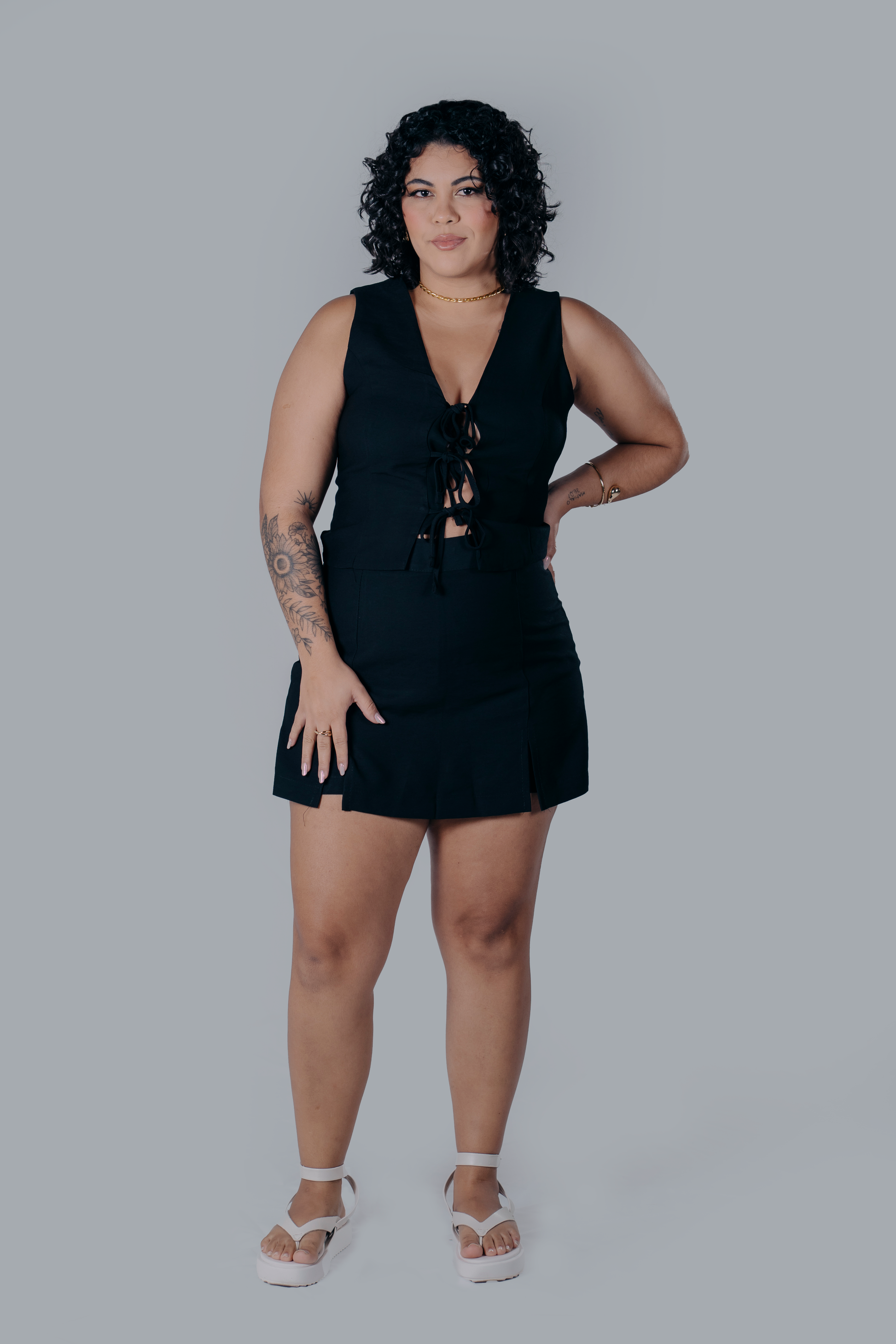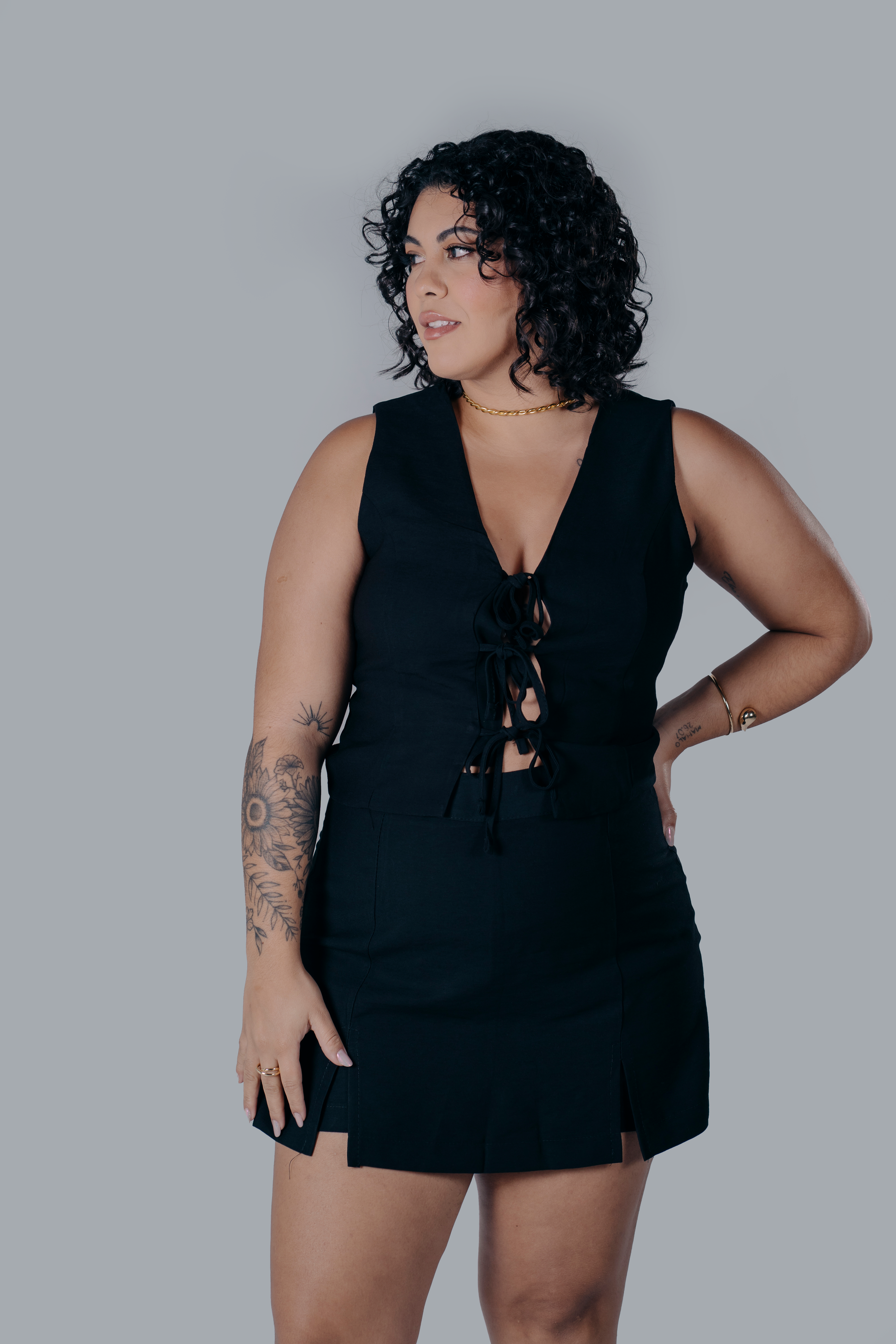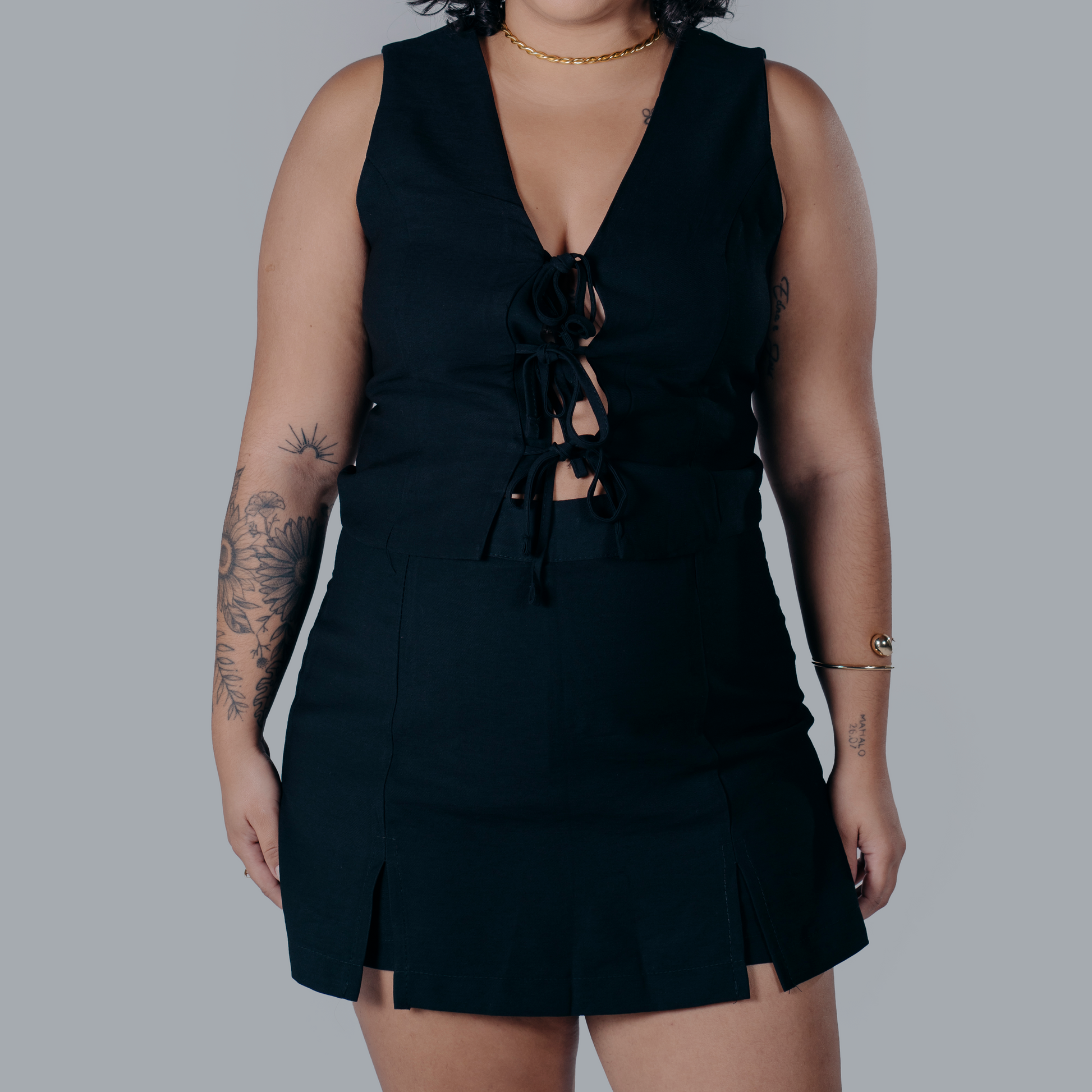 Conjunto de alfaiataria sofisticado e moderno, composto por uma blusa sem mangas e um short saia, disponível nas elegantes combinações de preto, branco e caramelo. A blusa destaca-se pelos delicados detalhes de amarração na frente, que adicionam um toque de feminilidade e charme. E o short saia, com fechamento em zíper nas costas, oferecem um ajuste perfeito e um caimento impecável. A modelagem ajustada e os tecidos de alta qualidade garantem conforto e elegância para ocasiões especiais ou produções mais formais.
