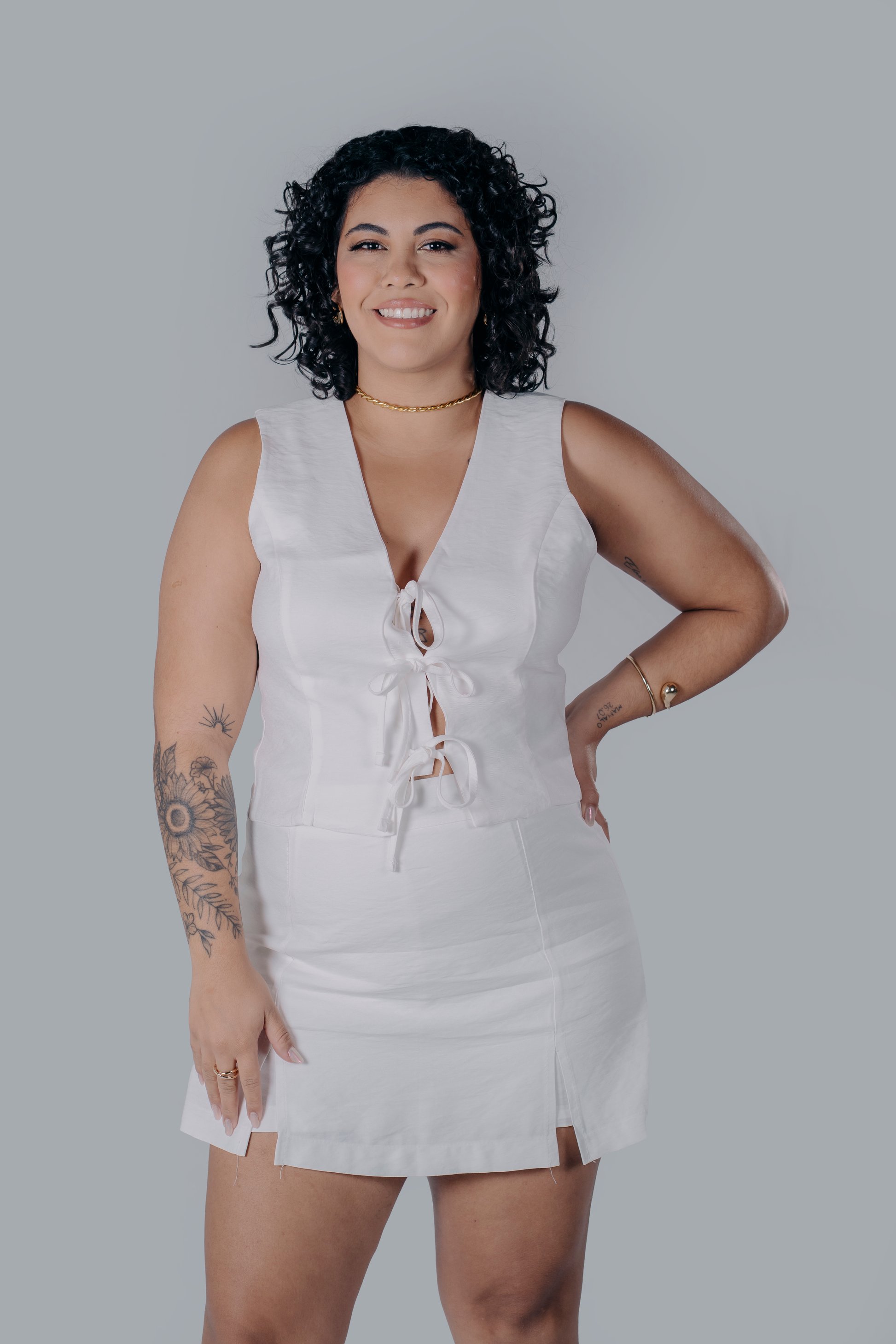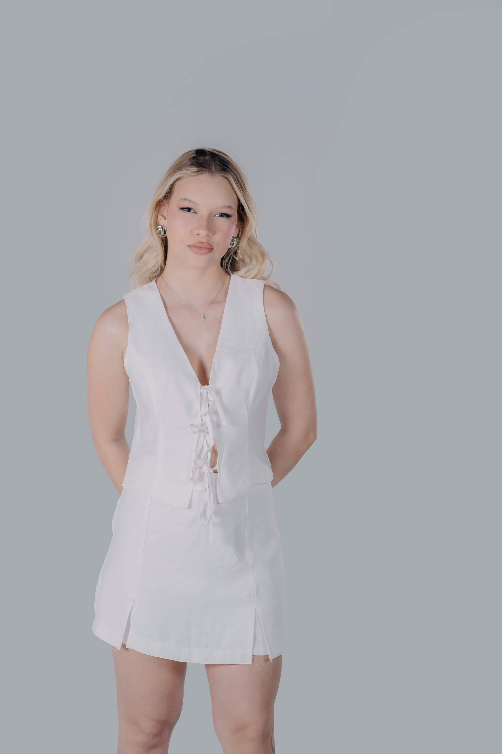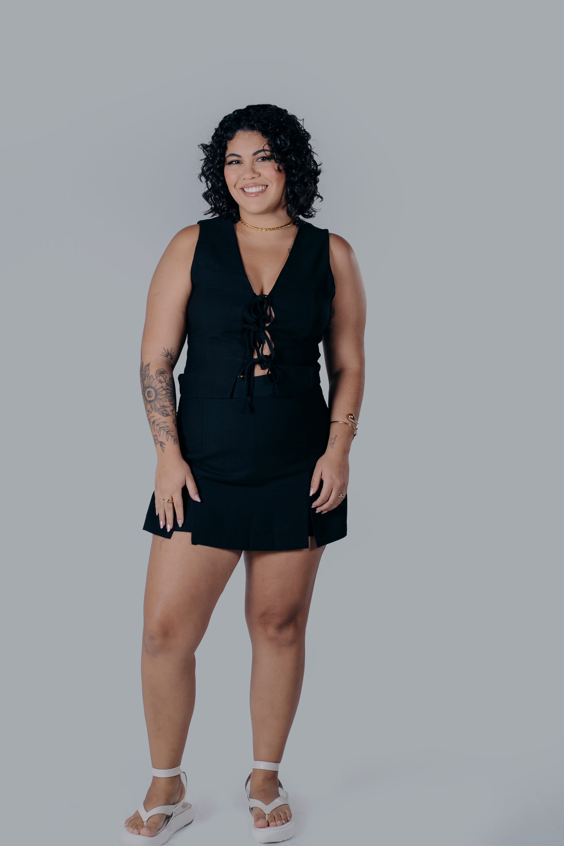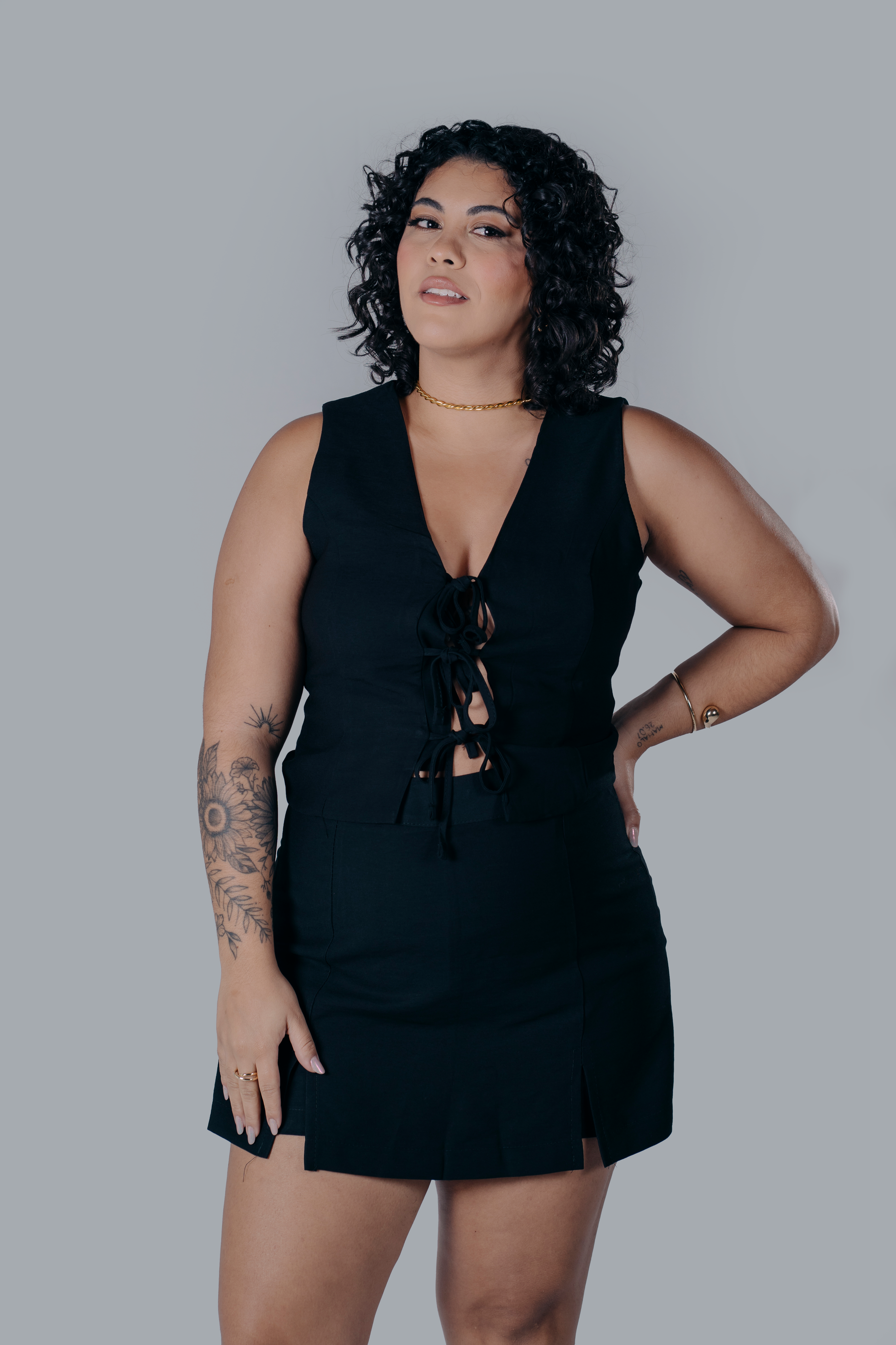 Conjunto de alfaiataria sofisticado e moderno, composto por uma blusa sem mangas e um short saia, disponível nas elegantes combinações de preto, branco e caramelo. A blusa destaca-se pelos delicados detalhes de amarração na frente, que adicionam um toque de feminilidade e charme. E o short saia, com fechamento em zíper nas costas, oferecem um ajuste perfeito e um caimento impecável. A modelagem ajustada e os tecidos de alta qualidade garantem conforto e elegância para ocasiões especiais ou produções mais formais.