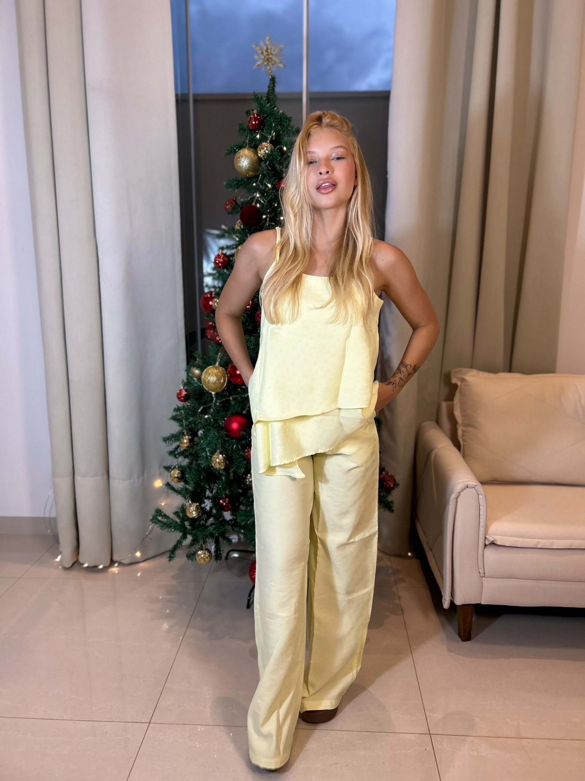 O conjunto Sunny é a definição de atemporal e elegante ao mesmo tempo. Composto por blusa de alcinhas com caimento solto e babado e calça pantalona, ele traz movimento.