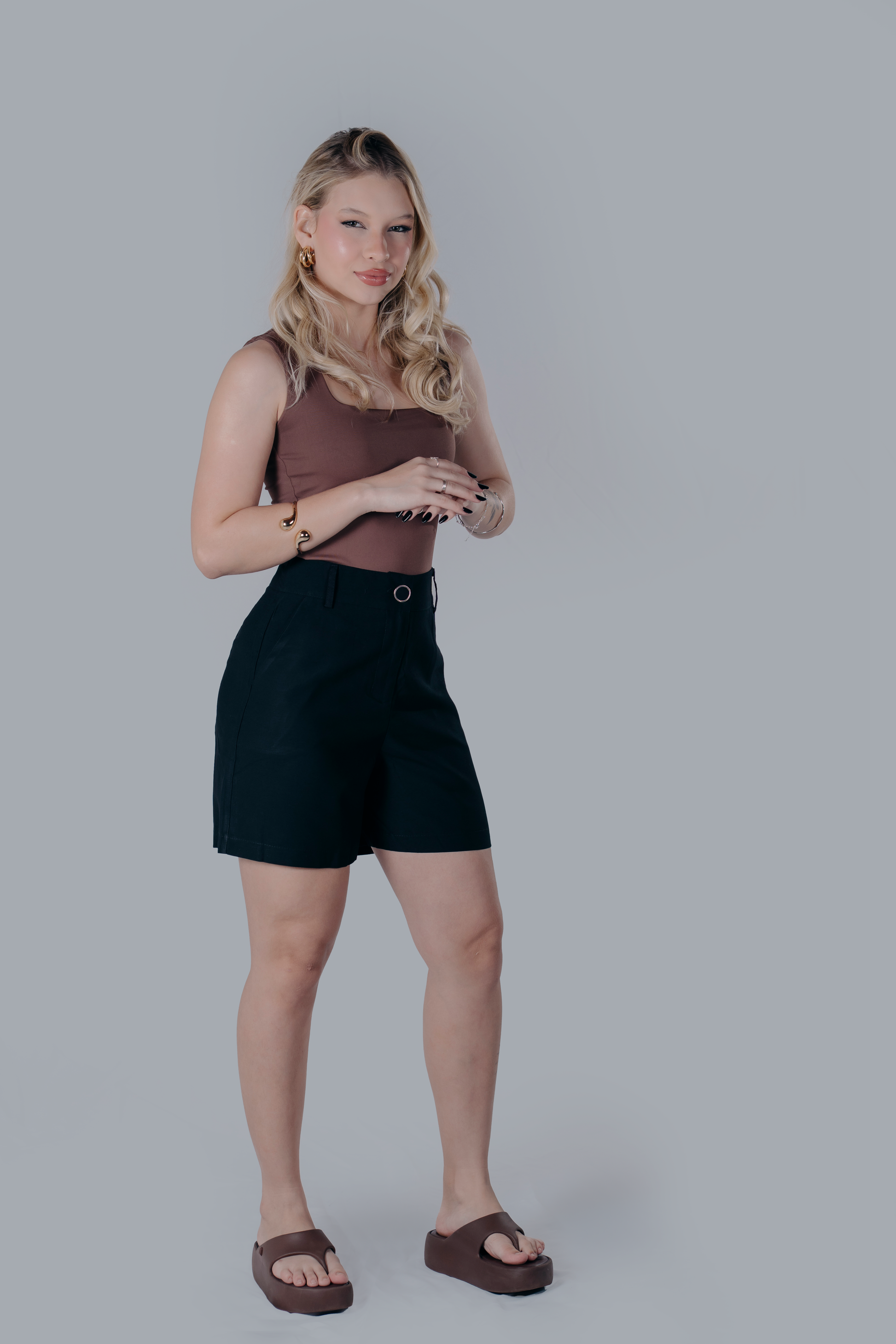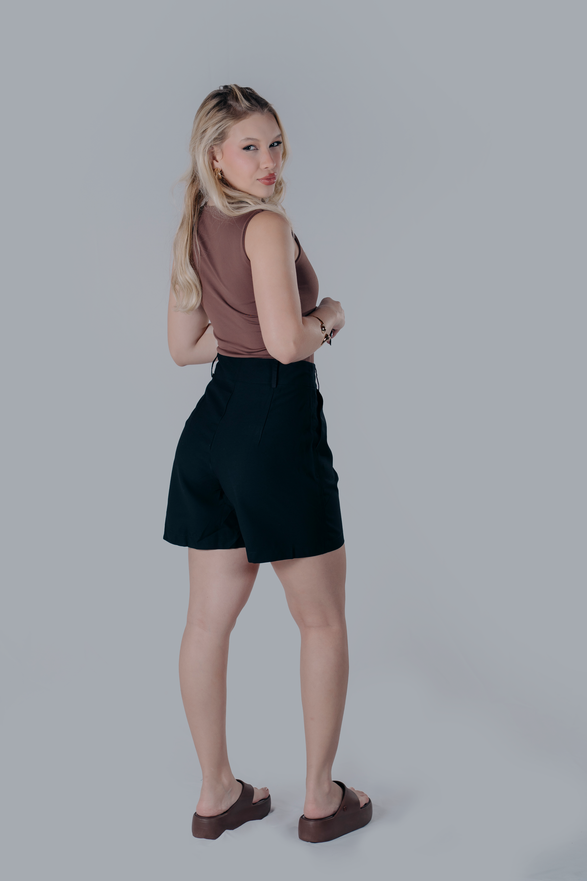 Short de alfaiataria na cor preta, com modelagem estruturada e acabamento impecável. Confeccionado em tecido de alta qualidade, combina elegância e conforto em uma peça versátil para diversas ocasiões. Conta com cintura média, bolsos funcionais e fechamento por zíper frontal e botão encapado, garantindo um ajuste perfeito ao corpo. Ideal para compor looks sofisticados com um toque moderno e atemporal.